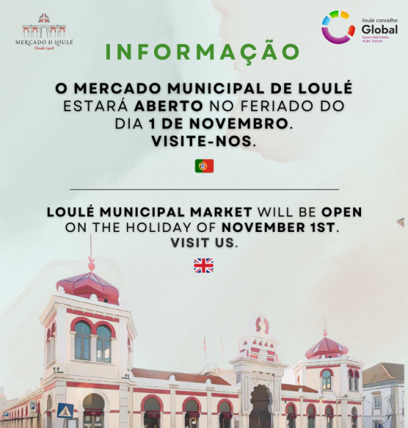 Informamos os nossos estimados clientes e visitantes que no feriado do dia 1 de novembro, próximo sábado, o Mercado Municipal de Loulé e a Praça da Restauração estão abertos. Aguardamos a sua visita.