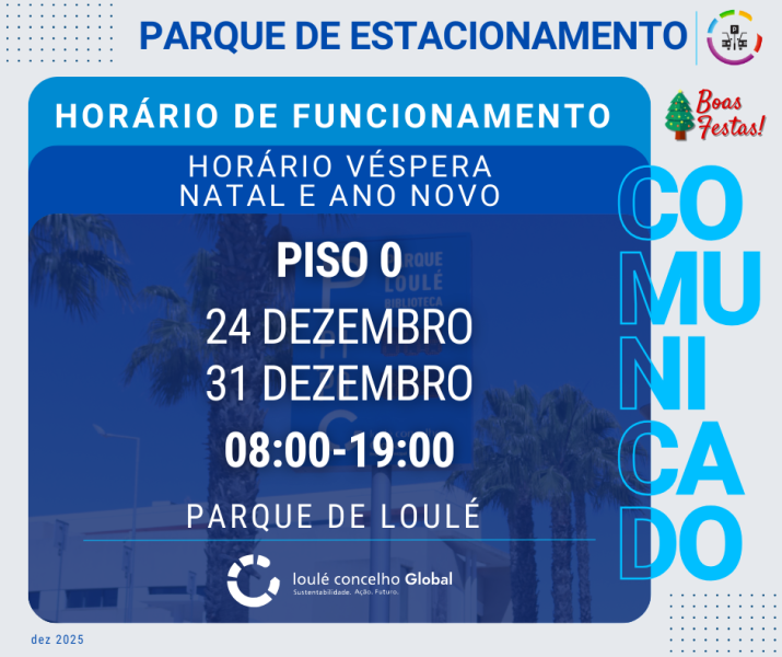 Informa-se que, nos dias 24 e 31 de dezembro, o Piso 0 do Parque de Estacionamento Municipal de Loulé encerrará às 19h.