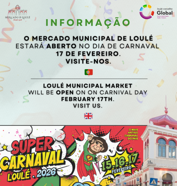Informamos os nossos estimados clientes e visitantes que no dia de carnaval 17 de fevereiro, terça-feira, o Mercado Municipal de Loulé e a Praça da Restauração estão abertos.