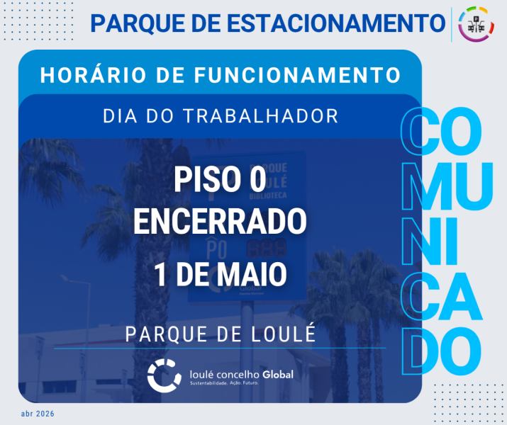 Informa-se que, no feriado de 1 de maio, o Piso 0 do Parque de Estacionamento Municipal de Loulé se encontrará encerrado.